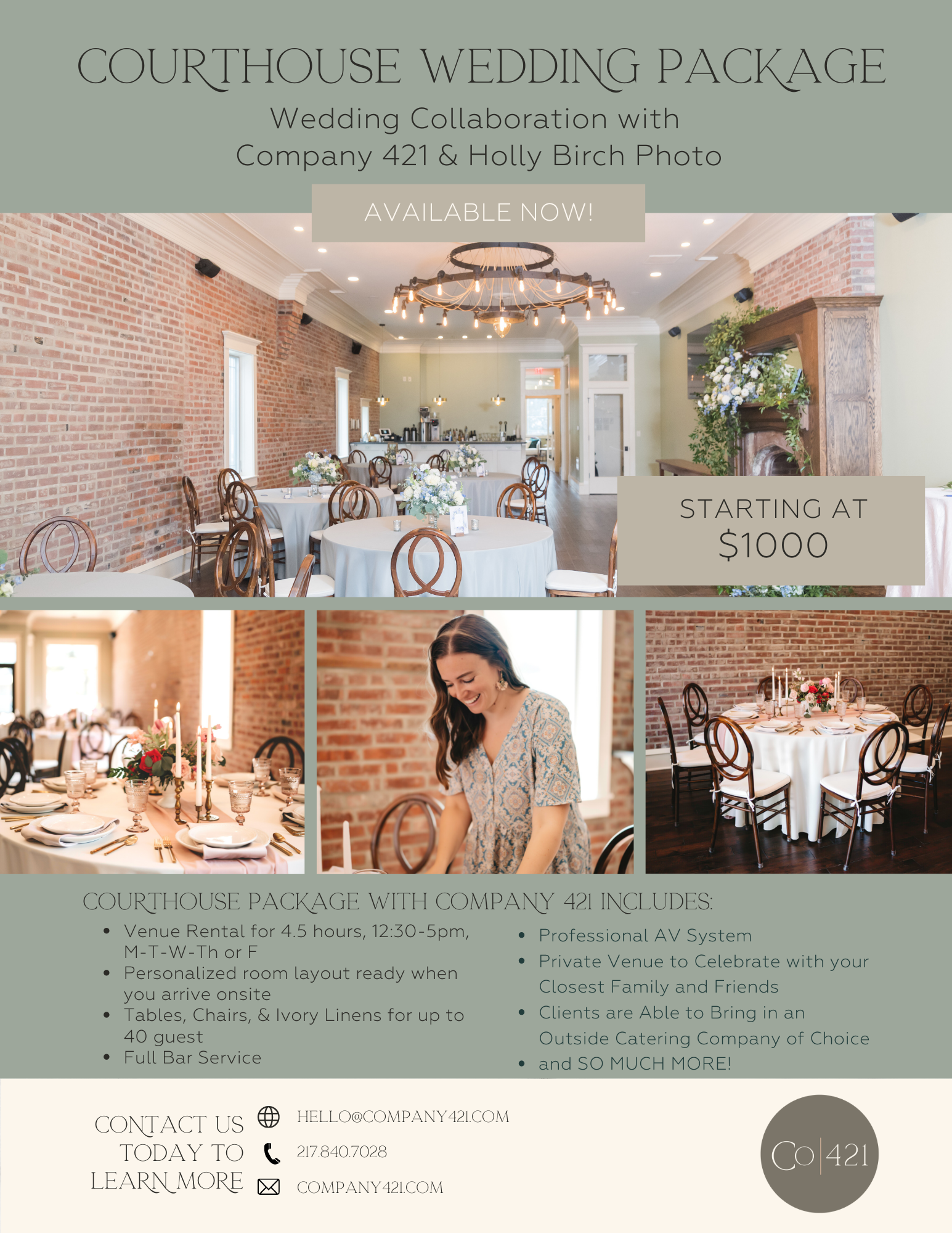 Be sure to check out our new partnership with Company 421 in Mahomet for all your courthouse wedding day needs!